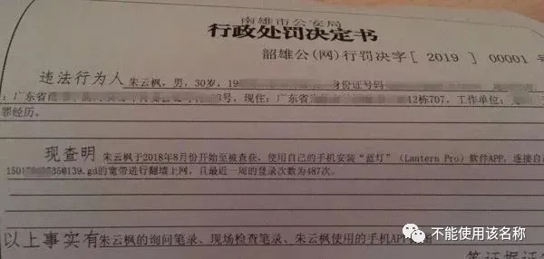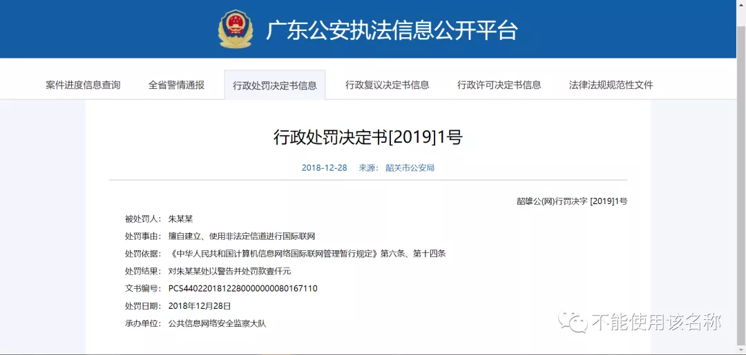 2018 年 12 月 28 日,广东韶关南雄市公安局对“科学上网”的朱某某作出行政处罚决定,理由为“擅自建立、使用非法定信道进行国际联网”,处以 1000 元人民币罚款,其处罚依据为《中华人民共和国计算机信息网络国际联网管理暂行规定》第六条、第十四条